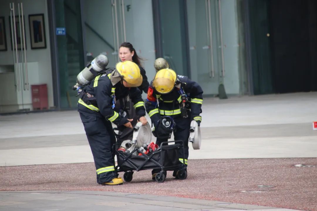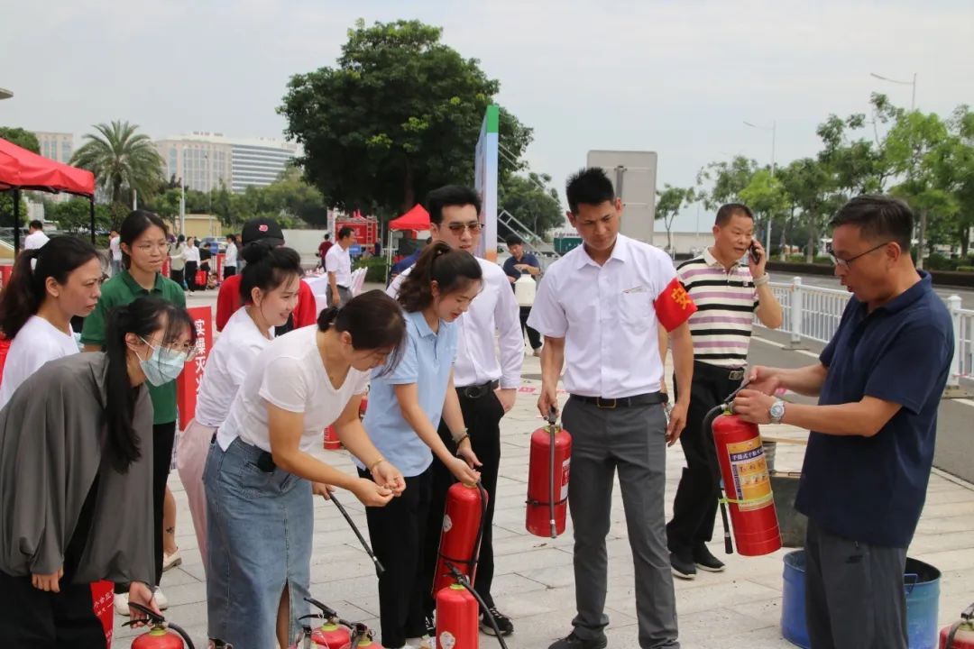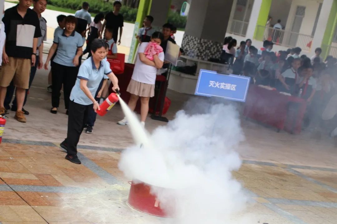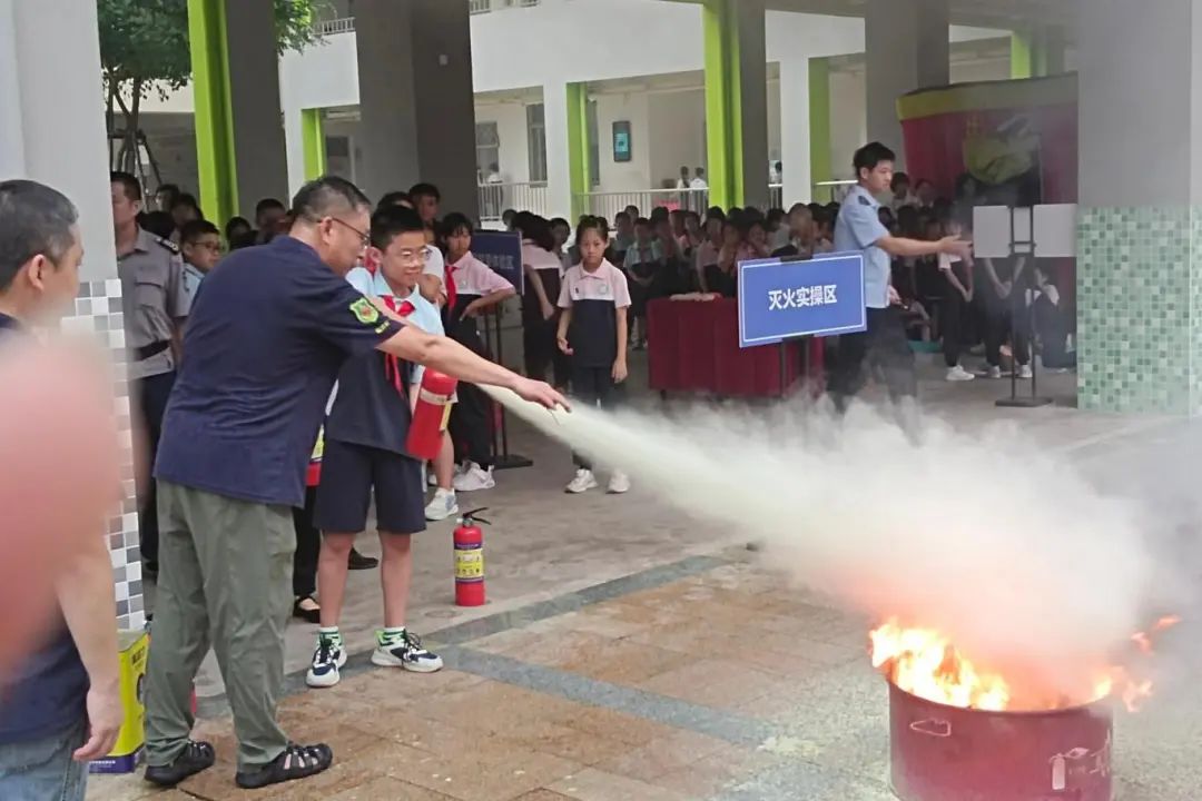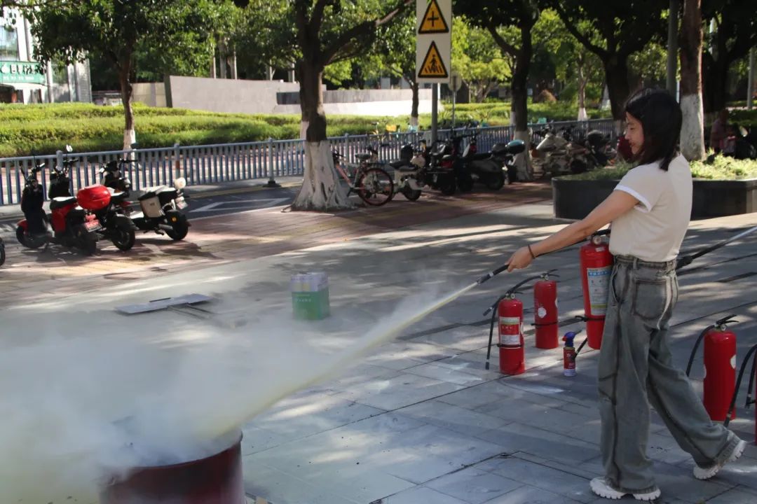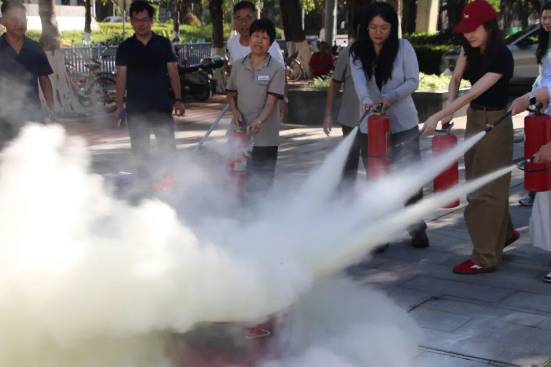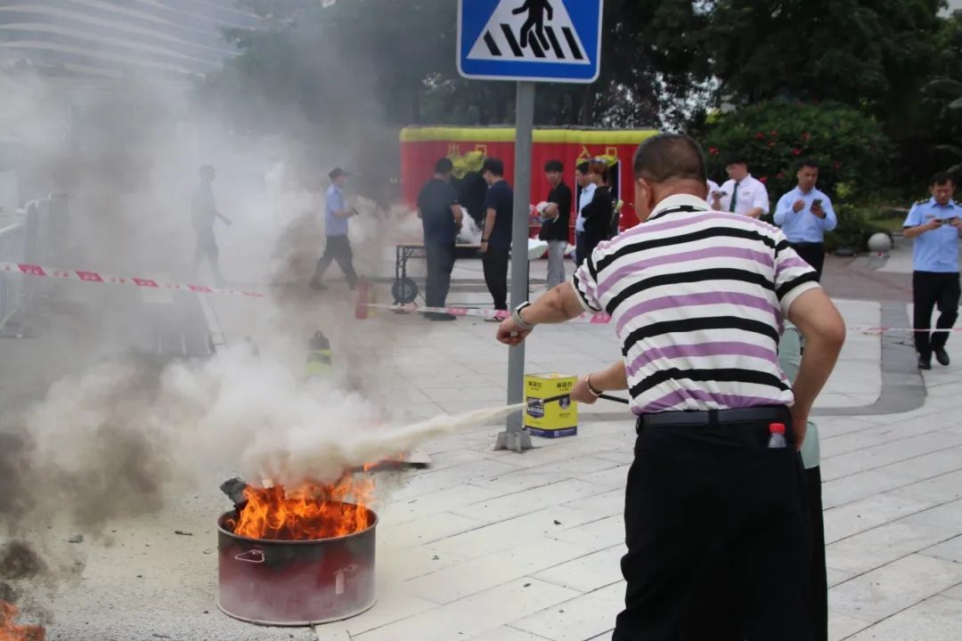 消防车驶入广场,消防员现场拆解消防车装备密码。从水带连接到灭火实操,针对办公楼电器起火、易燃物隐患等,拆解装备、手把手教用灭火器,使“拔销、对准、按压”成火情应对本能,筑牢安全“硬实力”。