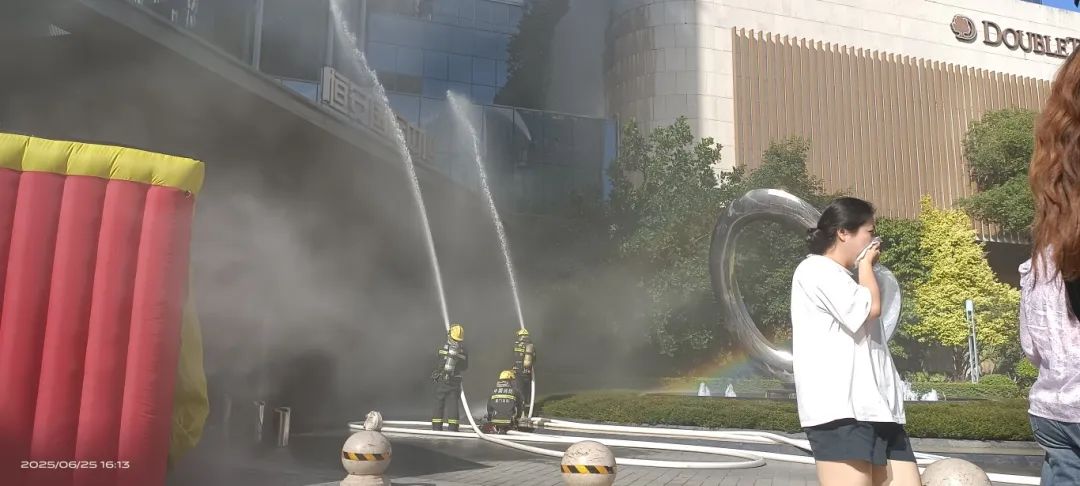 灭火行动组携带专业灭火装备冲向“火源”,与此同时,消防车呼啸而至,消防员熟练地连接水带、喷射水枪,精准扑灭商场所外的模拟“火源”。现场救护组随时待命,对 “受伤” 人员进行紧急救治。此外,VR 灭火体验、消防器材展示与灭火实操环节同步开展,专业人员手把手教学,确保市民遇到火情能冷静应对。