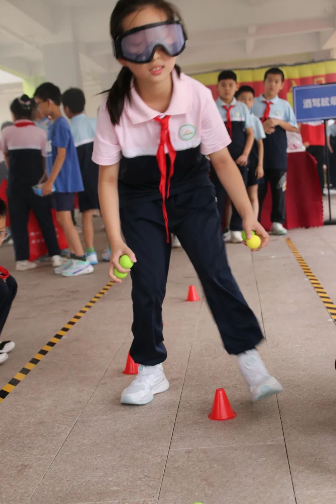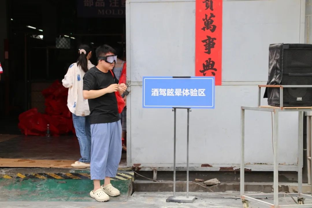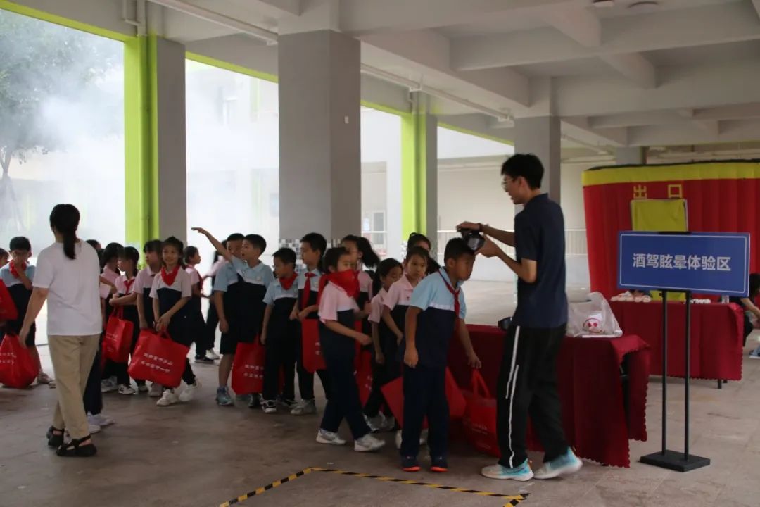 酒驾眩晕体验让孩子们戴上特制眼镜,模拟醉酒状态行走,直观感受酒驾的危害。现场的海报、标语等展示了安全生产相关知识等内容,图文并茂地为孩子们传递安全理念。